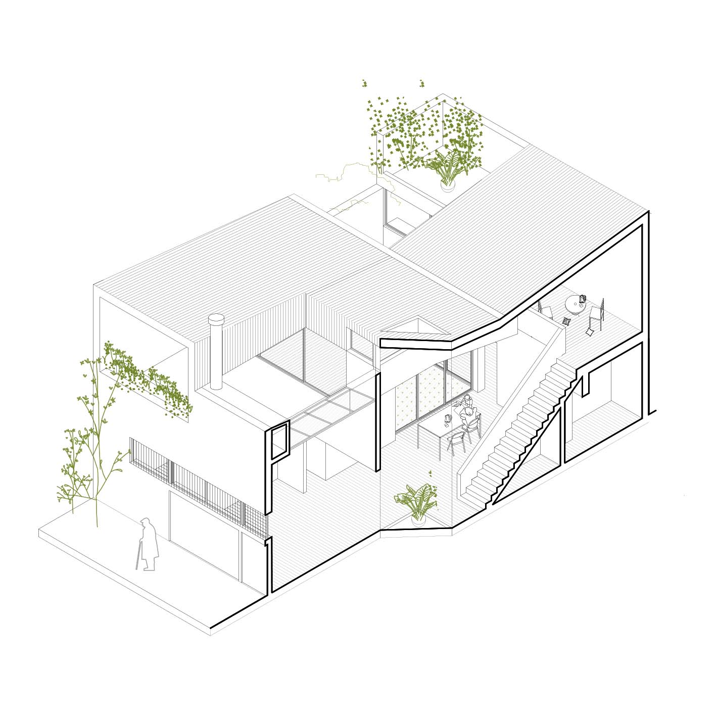El recorrido de la casa a través del gran vacío está acompañado por las distintas diagonales que definen su morfología - Escalera -Rampa. - Techo inclinado del conjunto.