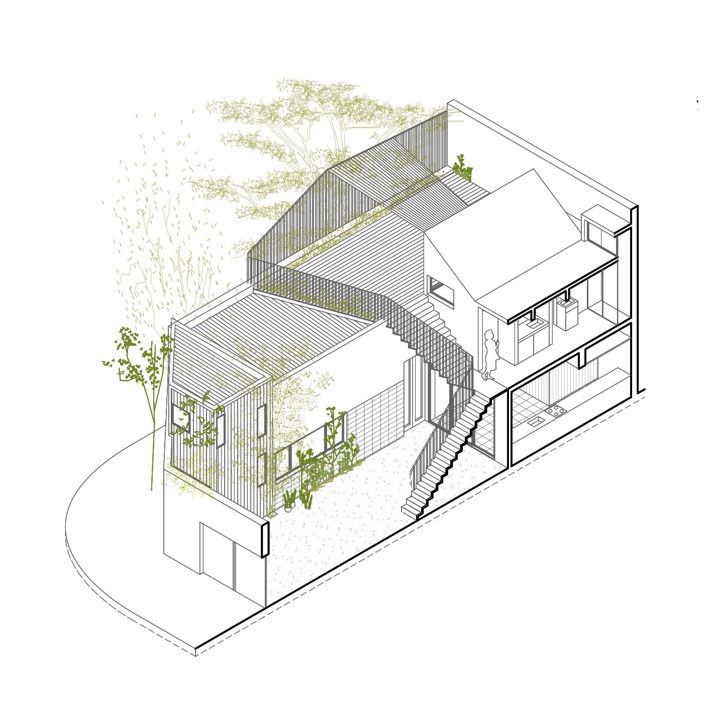 Luego nos propusimos agrandar la vivienda con dos volúmenes muy distintos, uno que toma la deformidad del lote en esquina y arma un baño en suite y un vestidor y el otro en planta alta que construye un estudio y acompaña al escalerón de subida a la nueva terraza.