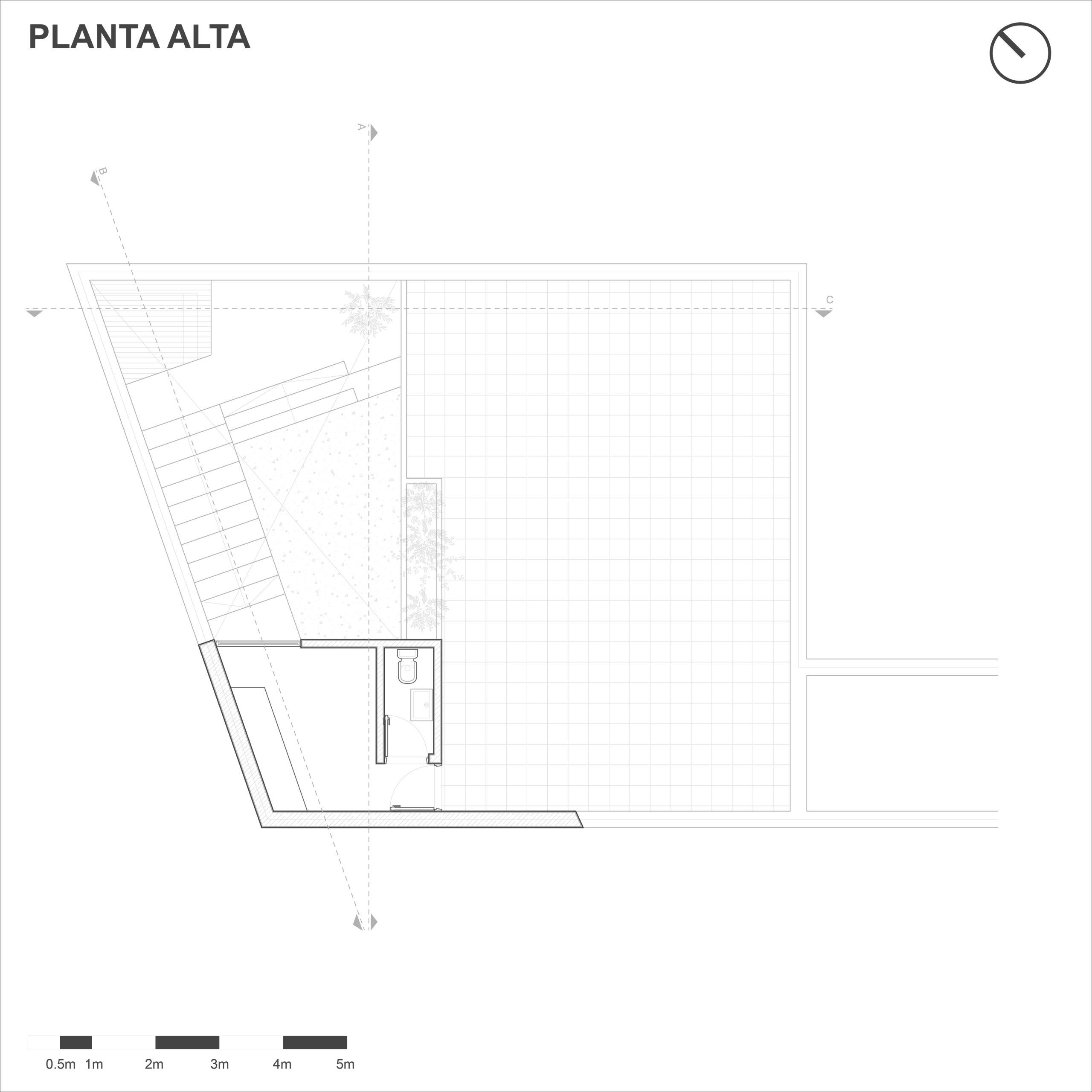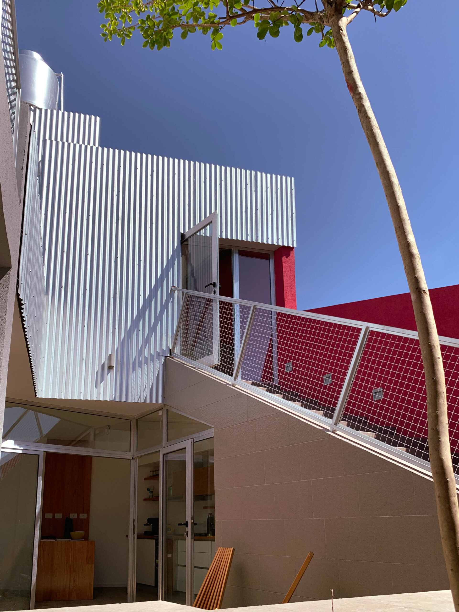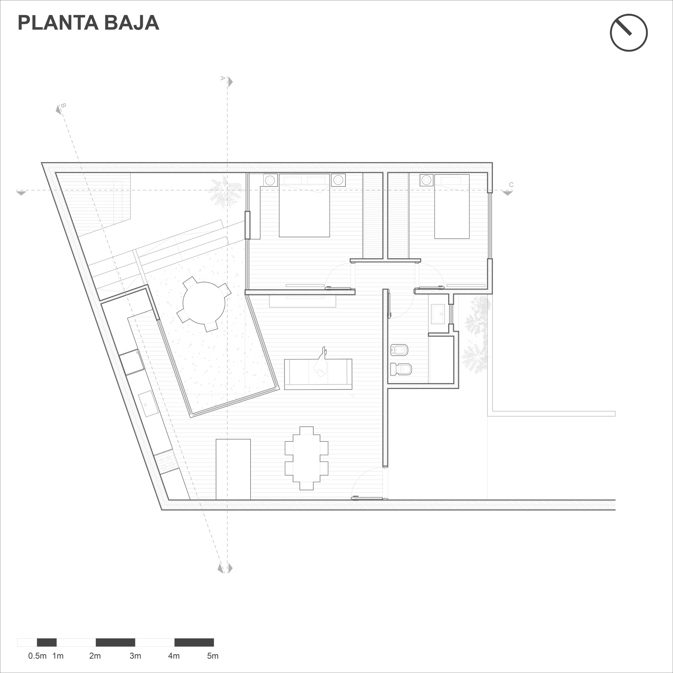 Sobre este diseño escalonado se sitúa la pileta, que continua la morfología general, basada en el juego de lo cóncavo y lo convexo del patio y un árbol que, junto a la perspectiva hacia el cielo y las diagonales, proyecta un paisaje propio hacia el interior.