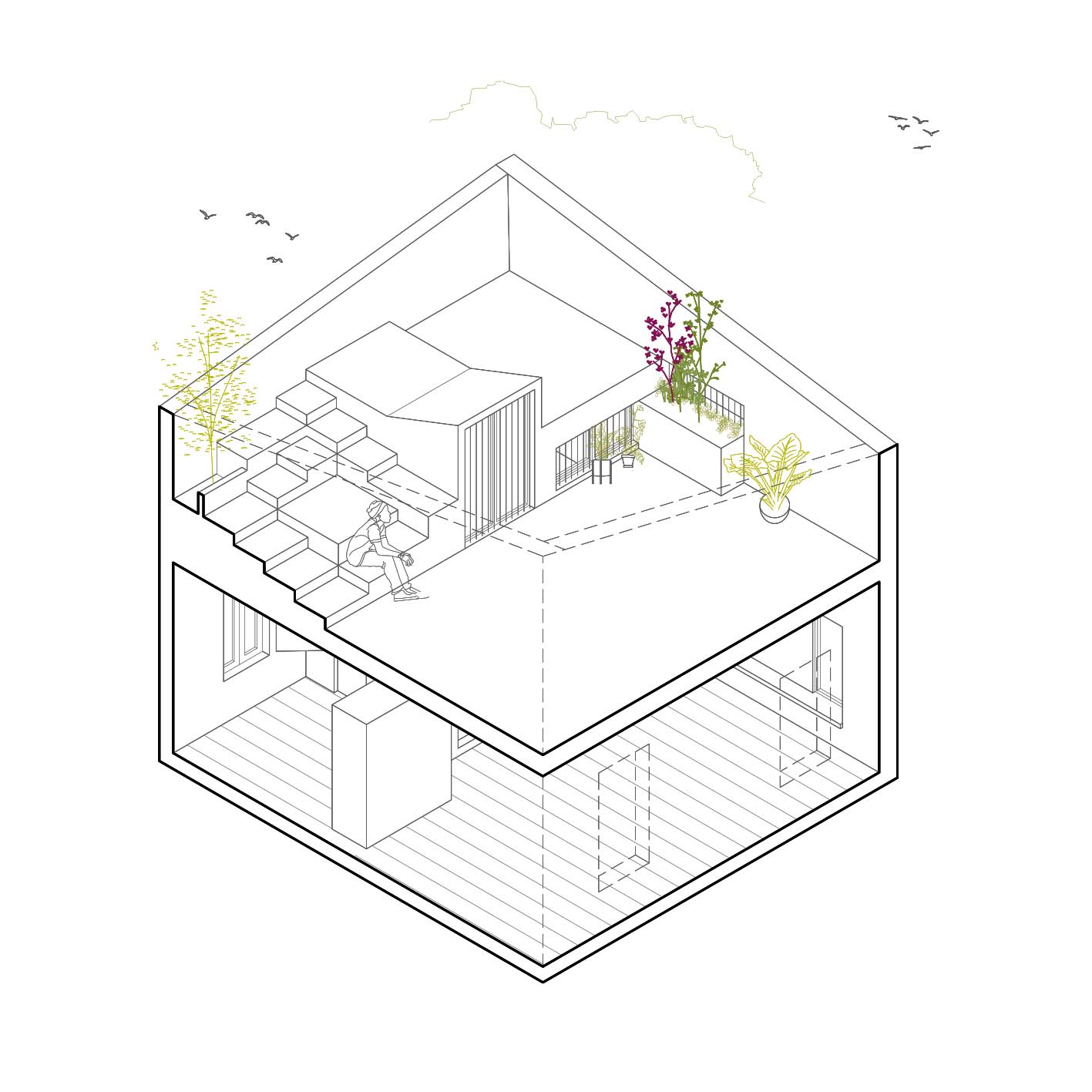 donde integramos toda la planta baja del departamento y sectorizamos el espacio de dormir con un volumen bajo